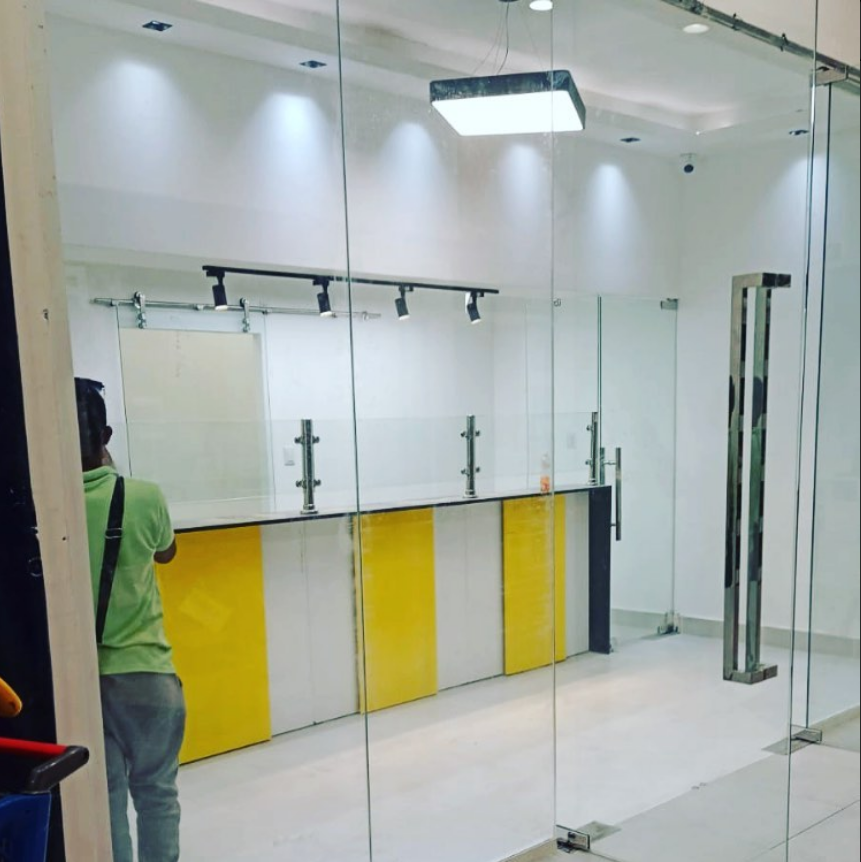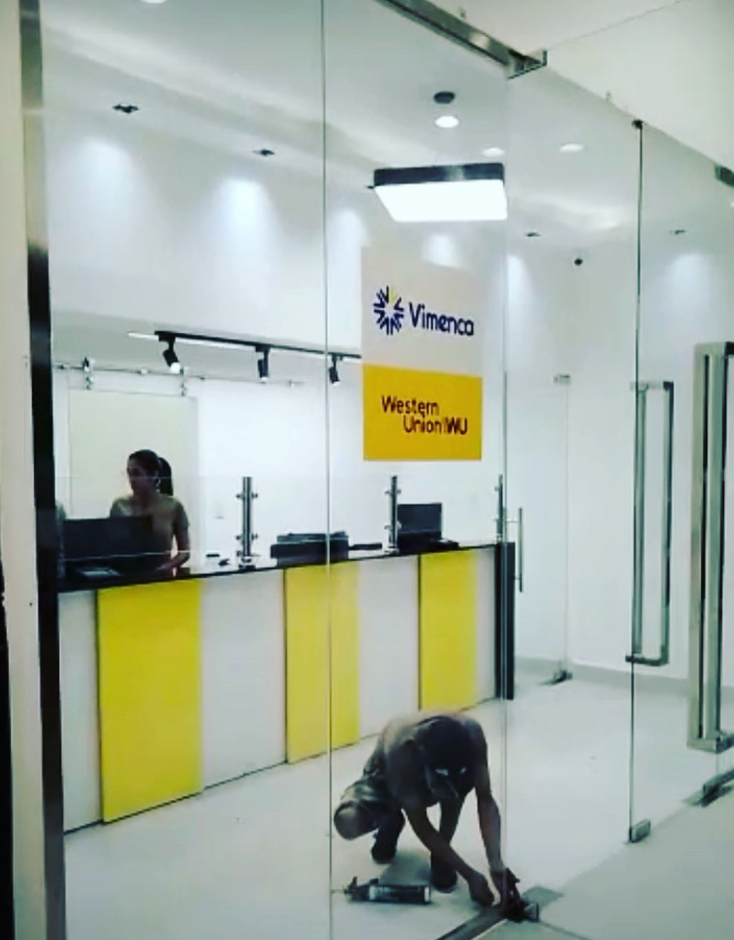 Instalación de Frente de Cristal con Puerta Flotante en Sucursal de Vimenca